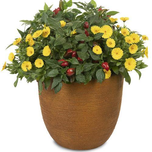 A hot pepper that works well in landscapes and containers. It may need trellising to maintain upright habit. Fruit transitions from geen to orange to red, with multiple colors represented on the plant at the same time. Fruits can be harvested when they begin to show good color and are fully ripe when solid red. Taste is pleasing if picked before full maturity. If you are growing this plant in a container, a 12" diameter (3 gallon volume) is the minimum necessary size. The ideal size would be a 14" to 18" (5-7 gallon) container.
